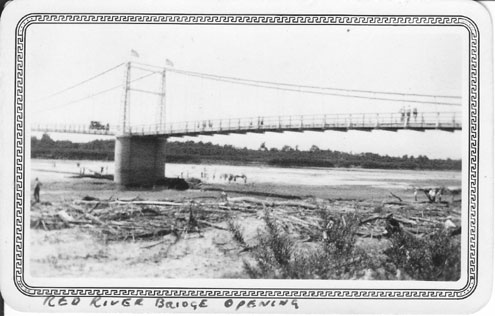 By July 1927 the Sowell’s Bluff suspension bridge was opened. The Dallas Morning News (DMN) of July 6 noted that the formal opening was a grand affair complete with the breaking of “a bottle of Red River water…by Miss Isabel Moor…” to christen the bridge.