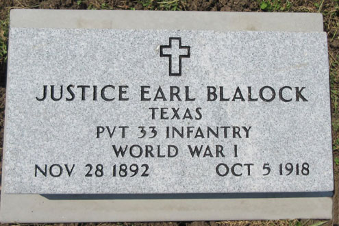 An article in the Bonham Daily Favorite of August 16, 1918 lists the names of 123 men called to appear before the local draft board from August 26 to August 30. One of these men, Justice E. Blalock, then 25 and farming near Ector, was apparently found fit and enlisted in the US Army on August 27, 1918. He was a private assigned to the 165 Depot Brigade and on September 24 attached to the 33rd Infantry. Sadly, his service was short lived.