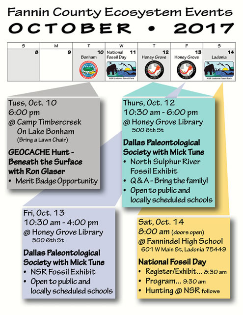 Fannin County -- A week of activities that allow folks to locate themselves in natural Fannin County will be the focus of weeklong events October 10 through October 14 as locals, students, visiting scientists, fossil hunters and enthusiasts gather here during National Earth Science Week. At the end of the four days of learning opportunities, participants will understand earthcacheing of locations around the county, see displays of rare and unusual fossils from the Cretaceous and Pleistocene Periods, and join in exploration for the same at North Sulphur River.