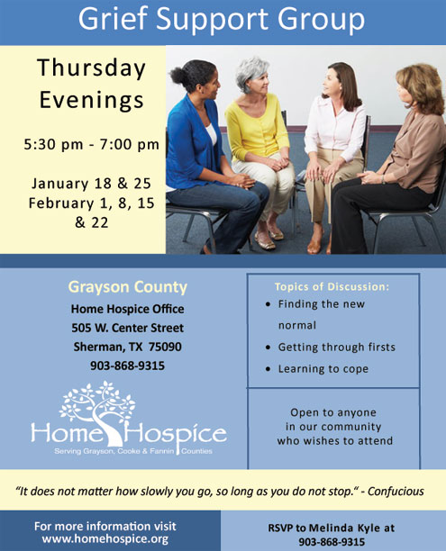 Sherman, Texas -- Home Hospice of Grayson & Fannin Counties is excited to announce the return of our six-week bereavement support groups. Each week the groups will be discussing topics such as “getting through firsts” and “finding a new normal.” These groups will meet at the Home Hospice office located at 505 W. Center Street in Sherman.