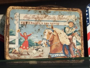 Around 450 - 500 different metal lunchboxes for school children were manufactured and sold between the 1950s and the 1970s. More than 120 million individual lunchboxes were sold, some with a matching thermos. Reportedly the first made was a Hopalong Cassidy lunchbox. Soon thereafter came the Roy Rogers box, one of which is in this collection.