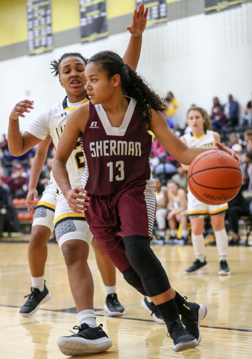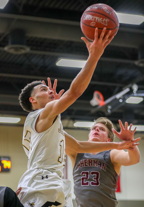 Sherman High School's Jaylen Edmonson drives to the bucket.
