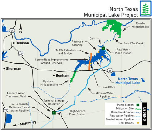 Related project components include constructing a pump station, installing a 35-mile raw water pipeline, improving various roads in Fannin County and building a mile-long bridge across the future lake. The District will also plant over 1.6 million trees, introduce 2,900 acres of other herbaceous plants and improve 40 miles of local streams. Water from the lake will flow to a separately planned new water treatment plant in Leonard with the initial capacity to treat up to 70 million gallons per day which will be transported through a planned treated water pipeline that will extend the northern part of the regional water system.