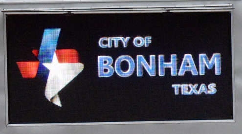 Bonham City Council briefly recessed in order to step outside and observe a 5' x 10' LED message center sign that could be placed at the corner of Hwy. 121 and Hwy. 56 and used to promote events in town. The cost would range from $35,000-$38,000 and be funded via the Hotel/Motel tax. The message center could be programmed remotely.