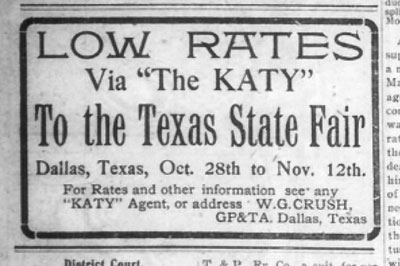 Early on the trains from Bonham and Honey Grove had special rates for Fair visitors. The ad below is from the October 3, 1905 Bonham News. The Honey Grove Signal reported on October 15, 1910 that "through the Dallas Fair season the Santa Fe train will leave each morning at 6:50 am and returning will leave Dallas at 7 o'clock pm. This is a splendid schedule for those who desire to visit the Fair. The train will arrive Dallas about 10:30, giving those who can spend only one day an opportunity to see a great deal of the fair." On one Sunday in October 1910 about 350 people from Honey Grove went to the fair on the train.