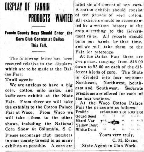 Many of the exhibits were agricultural. In 1912 there was a push for Fannin County to exhibit corn, cotton and milo at the Fair.