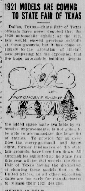 Seeing the new automobiles has always been a major Fair attraction. (When I was a youngster in Vernon my grandfather, who was a car salesman, always took us to the State Fair and I remember seeing the new cars and the Ice Capades.) The article below from the Bonham Daily Favorite September 20, 1920 says that the Automobile Building may not be big enough for all the automobiles to be exhibited.