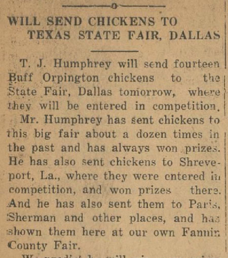 In 1928 a herd of cattle from Fannin County won 3rd place. That same year T. J. Humphrey was sending 14 chickens to the Fair for competition. The Bonham Daily Favorite reported that he had sent chickens to the fair about a dozen times and had always won prizes.
