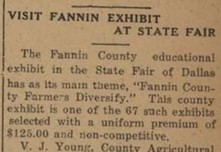 In 1932 there were many State Fair winners among the Fannin County Home Demonstration and 4-H club members. "Fannin county led all others in the number of prizes won for the third consecutive time." Ladies won first place for English peas, canned cherries, pickled peaches, pickled onions, cryst. citrus peel and pillow slip. In 1933 Fannin County Home Demonstration Clubs again won with 9 blue ribbons, 5 seconds and 7 third, in competition with 120 counties.
