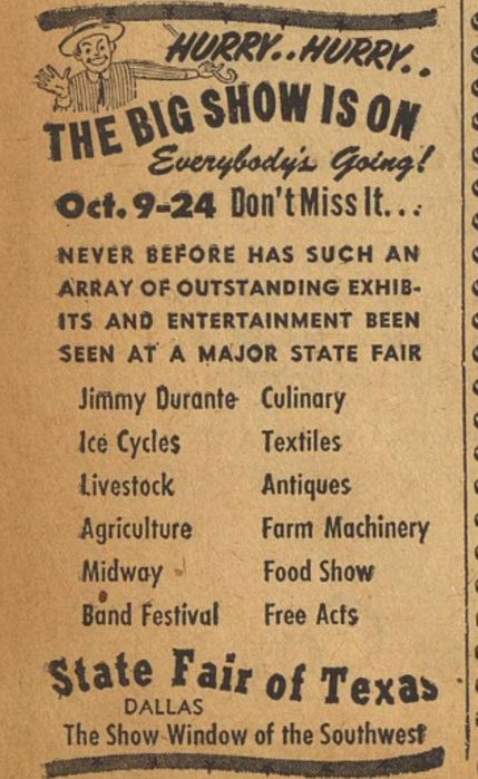 The Dallas Fair is only two week's in the future, and who is it that isn't anxious for the intervening two weeks to get out of the way? The Dallas Fair is the great Texas holiday, the biggest time of the year for the money. Armed with five or six dollars, a fellow can pay railroad fare, entrance into the exposition grounds, see two or three of the side shows, ride on the figure eight, pay a night's lodging, eat a hot weiner for dinner and a chile for supper and get back home perhaps with a quarter in his pocket. At the fair he will see all the world's improved machinery, the finest horses, cattle, hogs and chickens on earth, the biggest pumpkins, the finest cotton and all the other products of the greatest state in the Union. He will hear a fine band play, meet his friends from everywhere, and, if he likes such exercise, may feast his eyes upon twenty thousand of the prettiest women on each arrayed in a manner to lay the daisies, dahlias, and dandelions all in the shade. Hurry up the big show.
