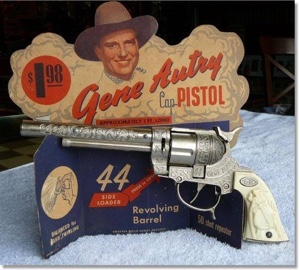 Mr. McIver (Who else?) owned McIver’s. He ran the store, along with his wife and several elderly lady clerks. The help often outnumbered the customers, but somehow Mr. McIver kept it altogether. He carried unusual items the other stores did not have, replacement heads for dolls, and little top hats to go on the heads, and the best toy rifle I ever owned. I think he also supplied the gems of my personal defense arsenal, a pair of Gene Autry .44s.