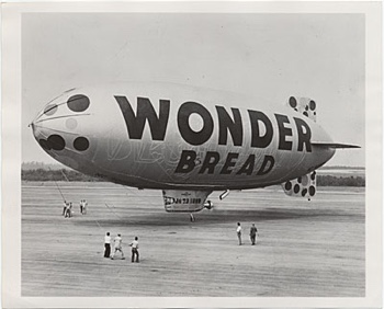 I had seen a blimp though, a USN surplus blimp, painted to look like a giant loaf of Wonder Bread—“builds strong bodies twelve ways.” I forget the twelve ways. I could look it up, but that’s what the Internet is for. This monster loaf used to fly around Tulsa, where we lived when I was two, tossing out miniature loaves of its namesake product to the people below.