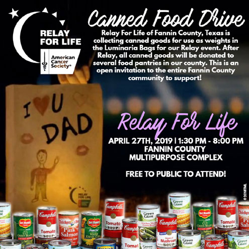 BONHAM - The Relay For Life of Fannin County, Texas, is holding a canned food drive during their event set for Saturday, April 27, in support of the luminaria ceremony. Registered Relay For Life participants and the community are encouraged to bring canned food donations.