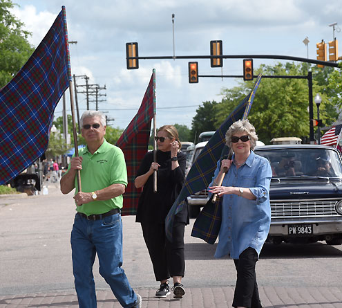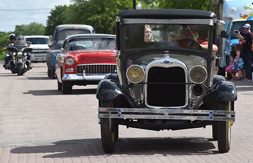 Glenn and Sue Taylor march in the parade, followed by Ruth Ann Thomas and a long line of classic cars.
