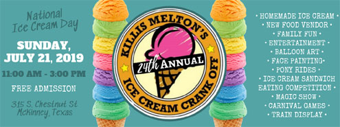 McKinney, Texas -- The coolest place to be on National Ice Cream Day, July 21, 2019, will be at Chestnut Square for our 24th Annual Ice Cream Crank-Off & Festival. Join us from 11:00 a.m. - 3:00 p.m. for family fun, food, entertainment, and plenty of delicious homemade ice cream.