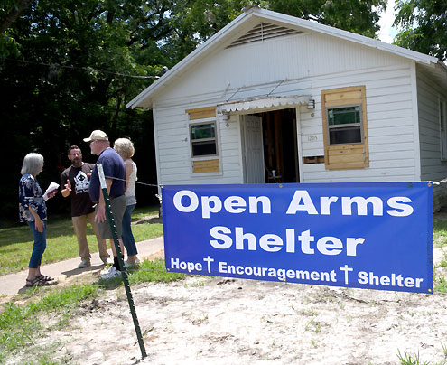 The shelter's website states: "Open Arms Homeless Shelter is a Biblical faith-based organization with a mission to provide the homeless in Fannin County with temporary shelter and guidance toward an independent life through hope, encouragement, and shelter."
