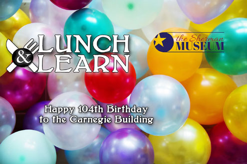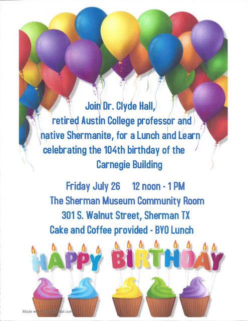 We will be celebrating the 104th birthday of the Carnegie Building, original home of The Sherman Public Library and current home of The Sherman Museum. Dr. Clyde Hall, professor emeritus from Austin College, is the featured speaker. Cake and Coffee will be provided – BYO Lunch.