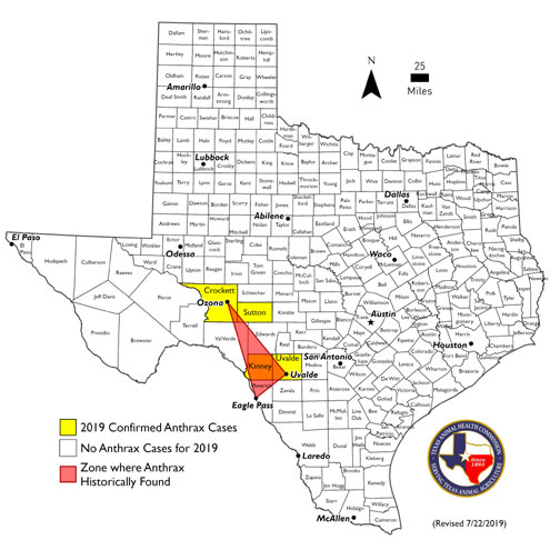 COLLEGE STATION — The Texas A&M Veterinary Medical Diagnostic Laboratory (TVMDL) plays a vital role in animal disease surveillance efforts, including anthrax. On average, TVMDL diagnoses two to three positive cases of anthrax annually in summer months. Thus far in 2019, the agency has confirmed 10 positive cases in several species, including exotic antelope, goats, horses, white-tailed deer and cattle. All positive cases have come from a Texas region with a historical presence of anthrax.
