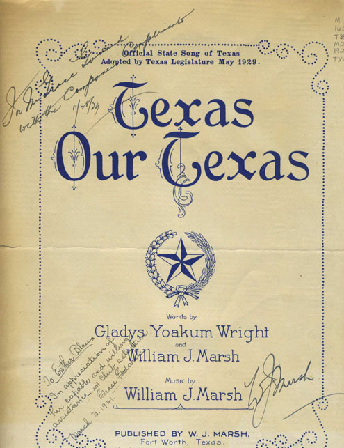 Drawn from the extensive sheet music collections at the Briscoe Center for American History, at the University of Texas at Austin, the compositions reflect various Texas themes: The Texas Centennial (1936), the Lone Star flag, bluebonnets, and Texas as a special place. One composition celebrating the Alamo and Texas Independence includes a tribute to James Butler Bonham on the cover. Also included is the official state song, “Texas, Our Texas, signed by the composer, William J. Marsh of Fort Worth.