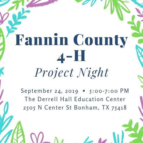 Fannin County, Texas -- Fannin County 4-H will be hosting Fannin County 4-H Project Night on September 24, 2019 from 5:00-7:00 p.m. at the Derrell Hall Education Center at 2505 N Center St Bonham, TX 75418.