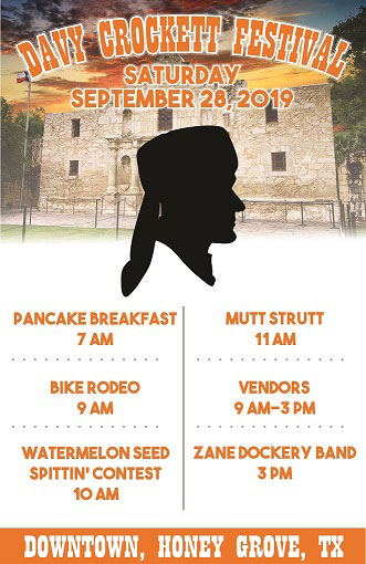 Honey Grove, Texas -- Pull out your coon skin caps and make plans to head over to Honey Grove on Saturday, September 28, 2019, for the annual Davy Crockett Festival! Festivities will kick off at 7:00 a.m. with a pancake breakfast sponsored by Masonic Lodge #164.