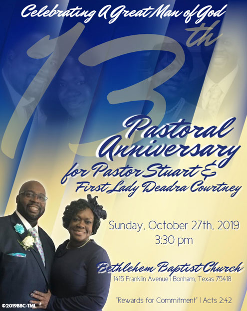 This past Sunday, Bethlehem Baptist Church, organized in 1871 in a log cabin on the estate of Mrs. Annie Garrett, held it's 13th Pastoral Anniversary to honor Pastor Stuart P. & First Lady Deadra Courtney. Pastor Robert Townsend from The Rock - Mt. Pisgah Missionary Baptist Church from Richardson, Texas, was the featured speaker Sunday afternoon at Bethlehem Baptist Church.