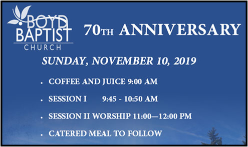 Boyd Baptist Church 70th anniversary Nov. 10