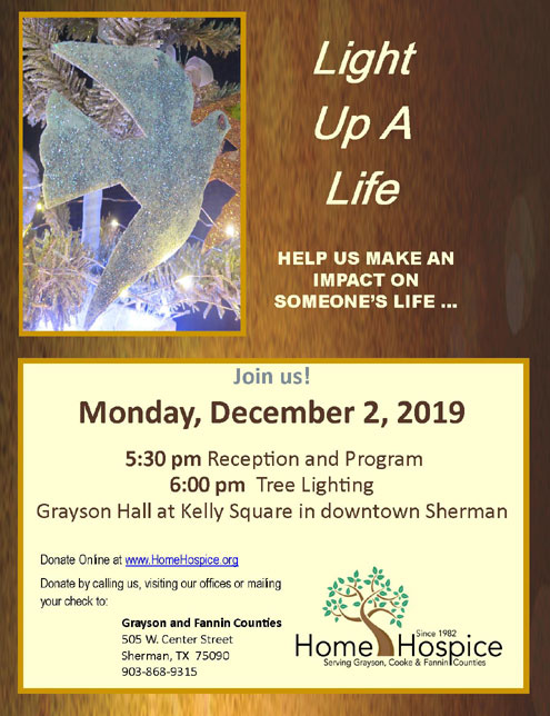 Sherman, Texas -- The Auxiliary of Home Hospice of Grayson County is hosting their 31st Annual Light Up A Life Tree Lighting Ceremony on Monday, December 2 at Kelly Square in Sherman. Friends, patients and staff join together to celebrate those that have touched our lives by honoring or remembering them with a dove on our Tree of Lights. It begins at 5:30 p.m. with a reception and refreshments before our Tree Lighting Ceremony starting at 6:00 p.m.