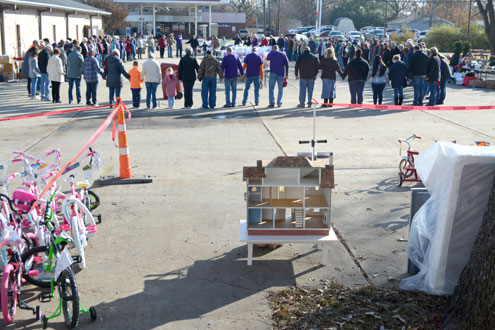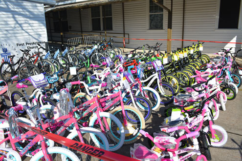 The Kiwanis Club set up a gift wrapping station for items chosen as gifts. 73 brand new bicycles which were given away in a drawing were donated by First Presbyterian Church members and some other individual donors.