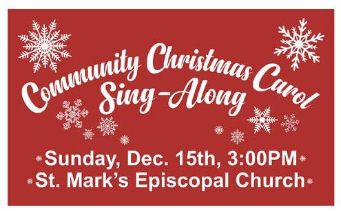 Honey Grove, Texas -- The annual Community Christmas Carol Sing-Along at the lovely St. Mark church building at 8th and East Market Street in Honey Grove will be held on Sunday, December 15 at 3:00 p.m.