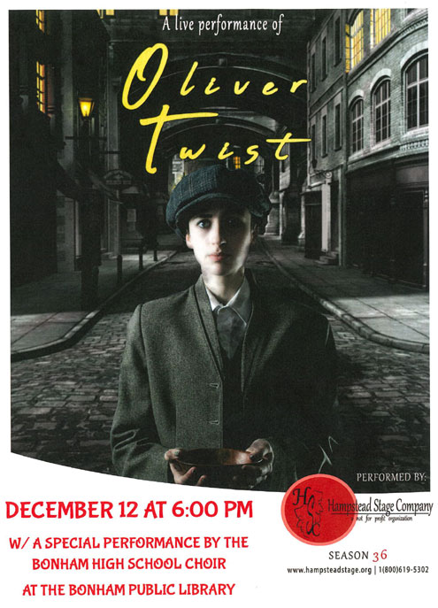 Don't miss a live performance of Oliver Twist by Hampstead Stage Company and a special performance by the Bonham High School Choir.