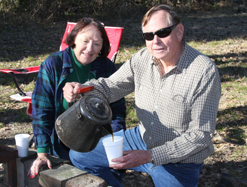Most were impressed at the flavor of my ‘camp coffee’. Many had never tasted coffee cooked over a campfire that was actually ‘boiled’ and not ‘perked’ in a modern coffee pot. I pointed out the fact that making camp coffee was very easy and it has much less acid that modern day brewing methods. Simply get the water boiling and toss in a handful or two (depending up on desired strength) of ground coffee. Let it boil for about 30 seconds and remove the pot from heat. Let it ‘steep’ about 5 minutes and then pour in a little cold water to settle the grounds. A little sugar tossed into the pot goes well with this strong coffee.