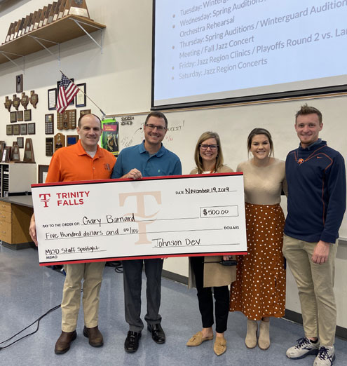 Gary Barnard received $500 as the winner of Trinity Falls’ MISD Staff Spotlight award. The quarterly promotion takes nominations from residents of Trinity Falls for deserving teachers or staff members at the three schools serving the McKinney-area community: Press Elementary, Scott Morgan Johnson Middle School and McKinney North High.