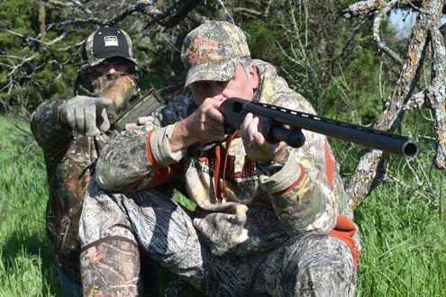 The next morning was cool and clear and the three of us set out ‘running and gunning’ for turkey. Randy knows every inch of the ranch and when we heard a gobbler responding to our hen yelps, we set off in a direct line to close the distance. The gobbler sounded off fairly close, we estimated him to be a little over 100 yards through the brush when Randy positioned the decoy while I located a bushy cedar tree with a low hanging limbs that would made a perfect blind to conceal the three of us.