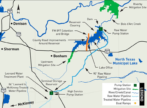 Other Bois d’Arc Lake projects include construction of the lake operations center, boat ramps, the raw water intake structure, pump station and pipeline to transport raw water to a treatment plant in Leonard, 35 miles from the dam. From the Leonard treatment plant, another pipeline will transport treated water 25 miles to connect to the existing NTMWD regional water distribution system.