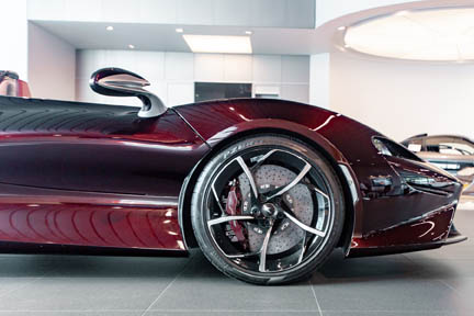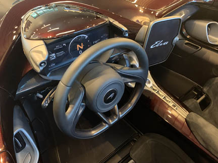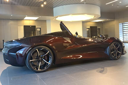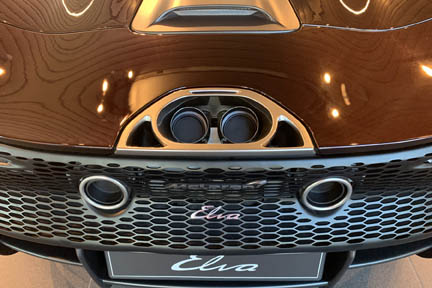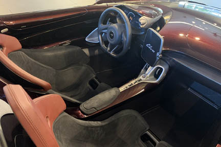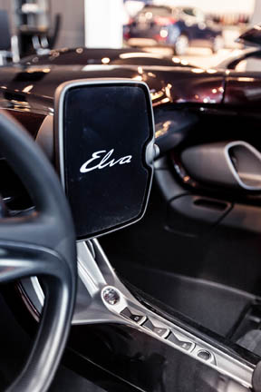 The Elva is constructed entirely of carbon fiber with very few body panels. Every square inch of the car incorporates F-1 inspired aero-technology. Powered by a mid-engine, 4-liter, twin-turbo V8, the Elva delivers 804-hp and 590 lb-ft of torque. Linked with a seven-speed dual-clutch automatic transmission, the Elva will launch its occupants from 0-to-60 mph in under three seconds…124 mph in 6.7 seconds.