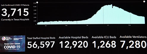 Texas hospitals currently have 3,715 new cases of COVID-19 cases. The last time that Texas hospitals had fewer COVID-19 patients was June 22 when hospitals had 3,711 patients. The surge topped out at 10,893 COVID-19 patients only a month later on July 22 before beginning a steady decline to the current level.