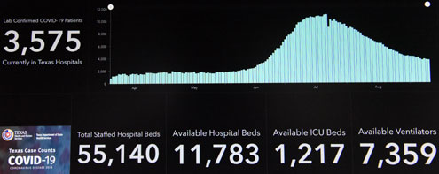 Texas Hospitals currently have 3,565 lab-confirmed COVID-19 patients, which reflects a slight reduction since the previous daily report. Hospitalization numbers have steadily decreased after peaking at 10,893 on July 22.