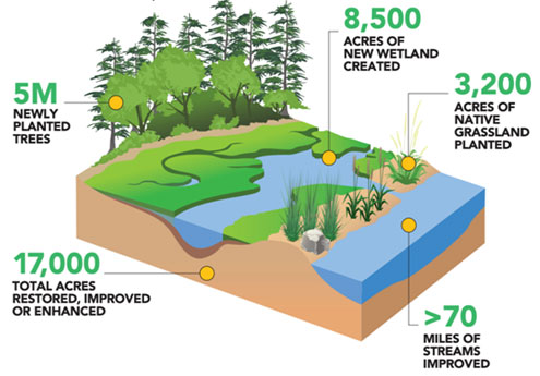 “Everything comes back to water,” explains Project Manager Matt Stahman with RES. “All of the habitats we’re restoring—thousands of acres of grasslands, wetlands and woods—all of it is driven by water. If we can slow down the water across the landscape and let it soak into the ground, the better chance that the other habitats we restore [including trees and grasslands] will succeed. Previously, a lot of the streams had been straightened for drainage. One of the major things we do is restore these streams to their natural wavy, winding configuration,” Stahman explained.