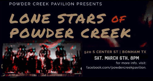 Bonham, Texas -- Powder Creek Pavilion in Bonham will host "The Lone Stars" Saturday, March 6, beginning at 8:00 p.m. This will be a magical evening of area singers and songwriters playing your heartstrings in the rustic surroundings.