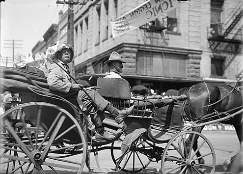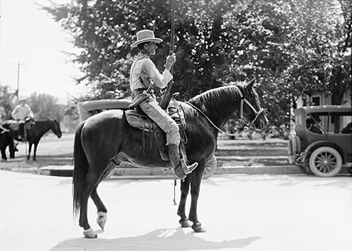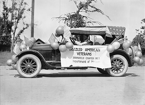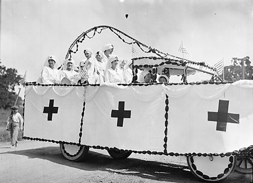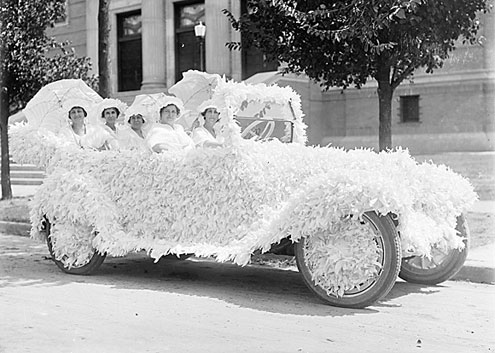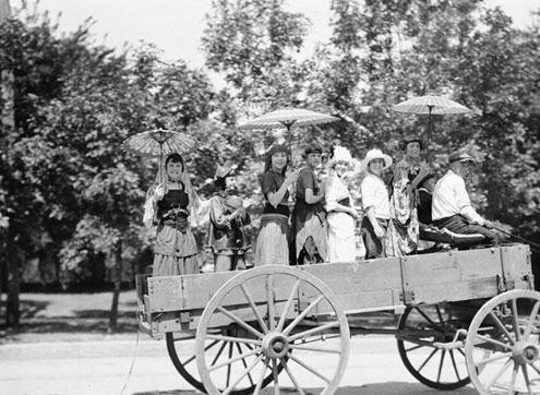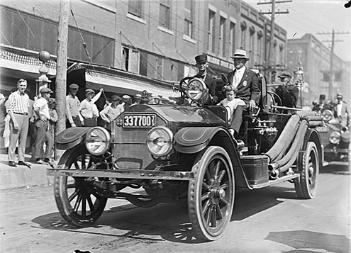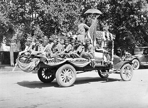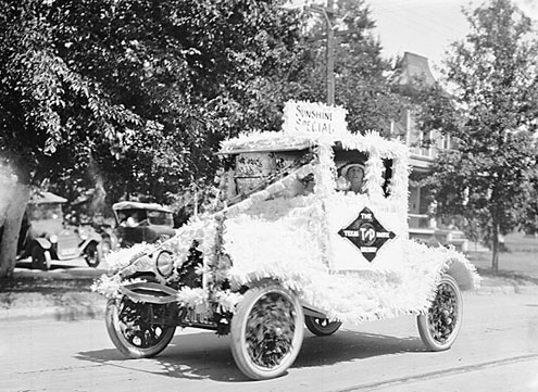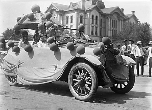 The Daily Favorite reported that more than ten thousand spectators, standing six to ten deep were packed into the parade route which ran south down Main, around the square and then north up Center Street and back to the park. What they saw was a procession of decorated automobiles, floats, equestrian units, military marchers, bands, wagons, bicycles and the fire department’s bright red American LaFrance pumper.