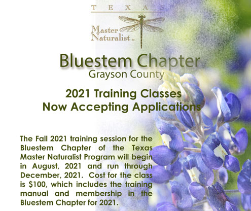 Sherman, Texas -- Applications are now being accepted for the fall training session for Bluestem Chapter of the Texas Master Naturalist Program.