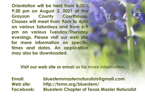 If you are interested in becoming a Master Naturalist, the basic training course for the Bluestem Chapter of the Texas Master Naturalist Program will begin this fall and applications will need to be in by July 1, 2021.