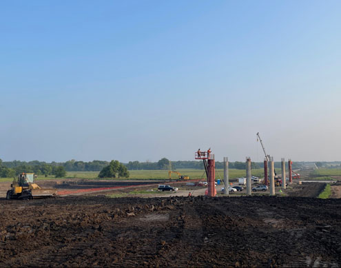 This photograph is facing north, with the existing Hwy. 34 to the right of the photo. Hwy. 34 will remain open until the bridges are complete and then the new roadway will be integrated into the existing highway. All drivers are encouraged to avoid distractions and stay alert while driving through the construction zones.