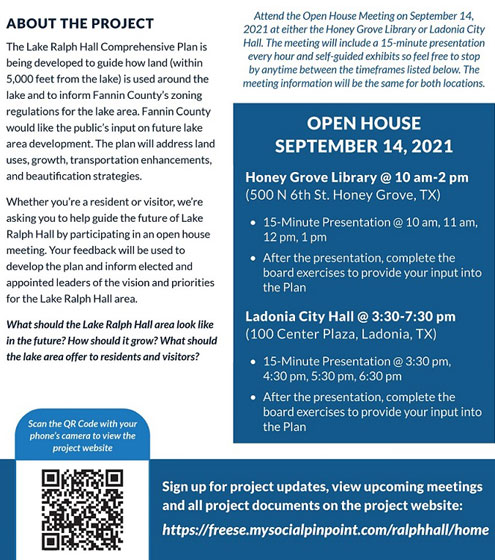 Fannin County, Texas -- Public Open Houses for planning for Lake Ralph Hall will be held on Tuesday, September 14 in Honey Grove and Ladonia. This is the opportunity for citizens to make their wishes known about development and recreational amenities around Lake Ralph Hall.