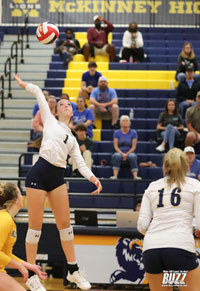 The District 5-6A opener between the McKinney Lady Lions and the Denton Guyer Lady Wildcats had fans on the edge of their seats for five sets before Guyer slipped by McKinney, 15-12, in the tiebreaker. (photo by Rog Pachuta/buzzphotos.com)" />