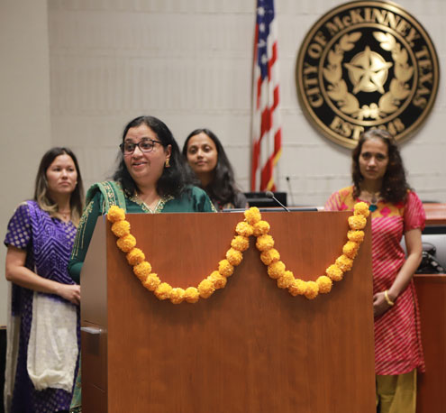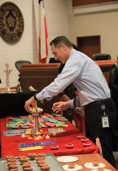 McKinney, Texas -- City of McKinney employees gathered Thursday to celebrate Diwali, one of the Hindu culture's oldest and most important festivals. Employees learned the history and traditions of the holiday and took part in lighting lanterns, creating rangolis with colored sand, and eating traditional Indian food.