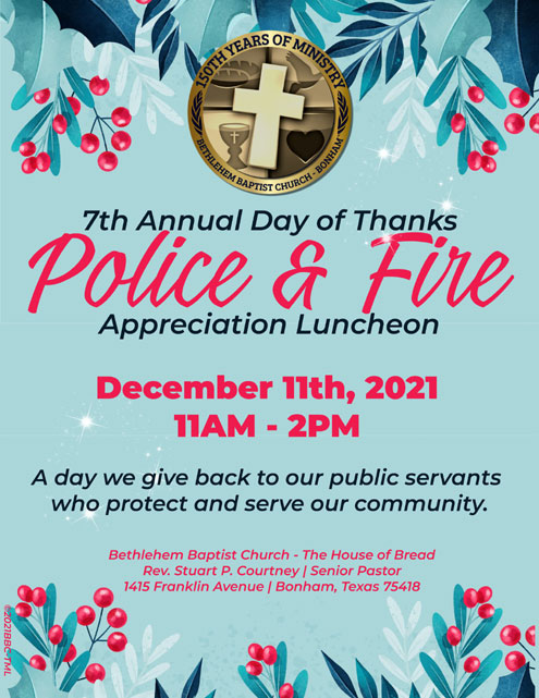 Bonham, Texas -- The Senior Pastor, officers, and members of the Bethlehem Baptist Church - The House of Bread would like to wish all of the dedicated men and women of every law enforcement and fire departments of Fannin County a very joyous and happy holiday season.