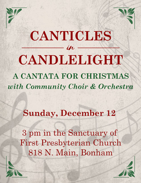Bonham, Texas -- The public is invited to celebrate the light of Christ this holiday season at the “Canticles in Candlelight”, a brilliant, sacred cantata performed by a community choir with orchestra accompaniment on Sunday, December 12 at 3:00 p.m. in the First Presbyterian Church sanctuary. With Scripture, narration, carols and candles, the cantata tells the treasured story of Christ’s birth.