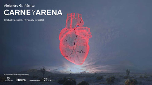 (Virtually present, Physically invisible) is a solo virtual reality experience that reunites frequent collaborators Alejandro G. Iñárritu and three-time Academy Award®-winning cinematographer Emmanuel Lubezki. It was originally produced by Leg-endary Entertainment, Fondazione Prada, and Emerson Collective and premiered at the 70th Festival de Cannes in 2017 as the first VR experience ever chosen as part of the festival’s Official Selection. In 2018, Iñárritu was presented a special Oscar® for CARNE y ARENA by the Academy "in recogni-tion of a visionary and powerful experience in storytelling."CARNE y ARENA